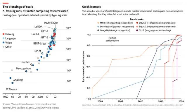过去几年,大模型俨然成为了一场AI的军备竞赛。在2015年至2020年期间,用于训练大模型的计算量增加了6个数量级,在手写、语音和图像识别、阅读理解和语言理解方面超过了人类性能基准。