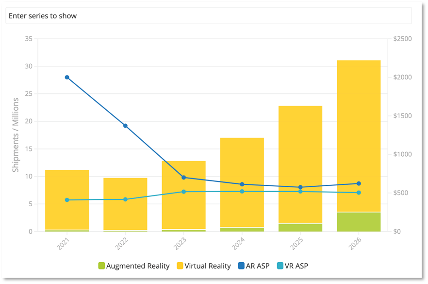 在IDC的预测中,AR在整个元宇宙硬件产品的出货量上将长期保持低比例,其数据显示2023年,AR硬件的出货量预计能达到36万台,而VR头显则会突破1244万台。甚至到2026年,AR硬件的出货量会上涨,但比例不会超过VR。