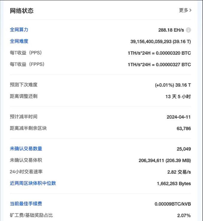 2月13日消息,BTC.com数据显示,目前比特币全网未确认交易数量为25,136笔,全网算力为288.18 EH/s,24小时交易速率为2.82交易/s,目前全网难度为39.16 T,预测下次难度上调0.17%至39.22 T,距离调整还剩13天小时。