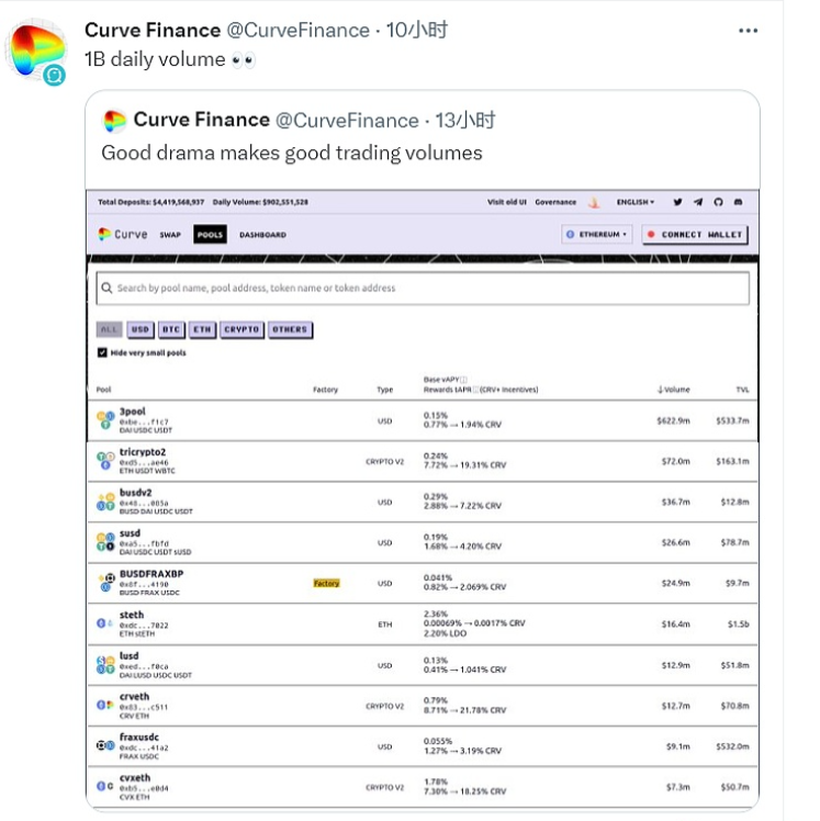 2月14日消息,据Curve Finance在社交媒体披露,其协议单日交易额突破10亿美元。此外,提供稳定币兑换服务的Curve(CRV)过去24小时内上涨了11%。 在Paxos的BUSD产品受到监管关注后,Curve(CRV)交易价格已升至1美元上方,虽然Curve尚未提供原生稳定币,但其即将推出的Curve USD(crvUSD)代币在加密货币市场中开始受到关注, 金色财经此前报道,Curve计划在今年六月部署美元挂钩资产,正在进行的提案将允许稳定币池向外部协议提供定价数据。