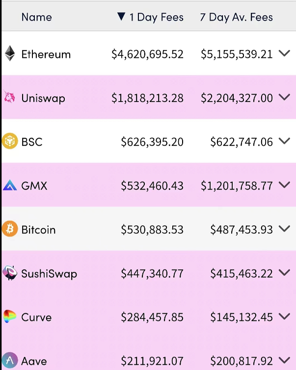 Cryptofees.info数据显示,最近24小时,以太坊链上手续费收入为4620695.52美元,Uniswap链上手续费收入为1818213.28美元,BSC链上手续费收入为626395.2美元,GMX链上手续费收入为532460.43美元,Bitcoin链上手续费收入为530883.53美元,SushiSwap链上手续费收入为447340.77美元。