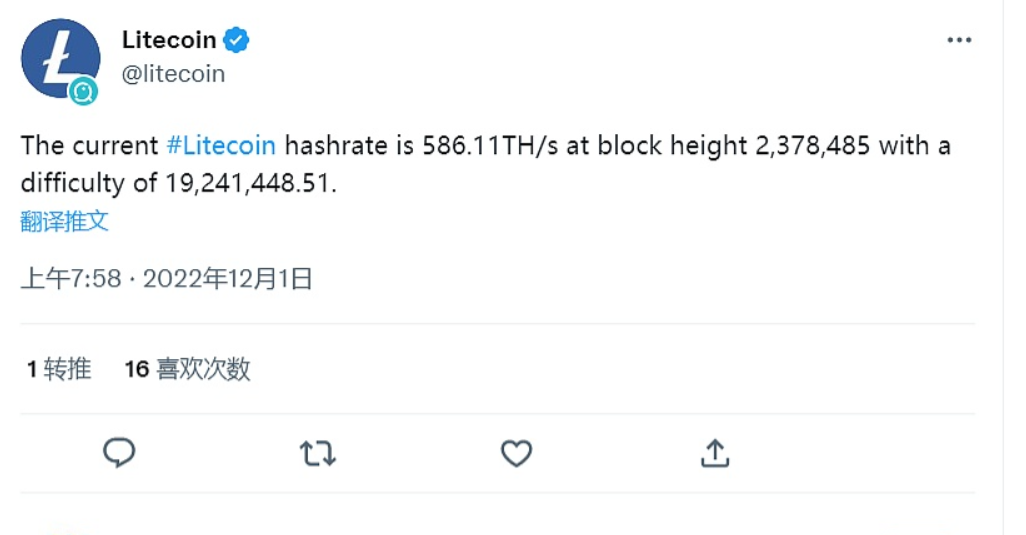 Litecoin发推特表示,目前莱特币的哈希率为586.11TH/s,区块高度为2,378,485,挖矿难度为19,241,448.51。