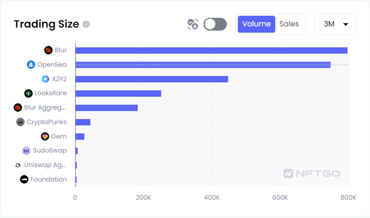 11 月 27 日,Blur在日买卖量方面超过了 Opensea,分别为 5.5K ETH(Blur)和 5.3K ETH(Opensea),持续一段时间后滑落,近三个月,Blur的以ETH计价的总买卖量接近800k eth,超过Opensea 748k eth的买卖量。目前是仅次于 Opensea 的第二大 NFT 市场。