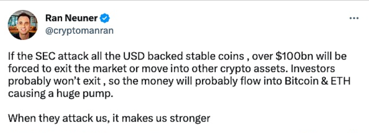 CNBC主持人Ran Neuner在社交媒体上称,如果美国证券交易委员会攻击所有美元支持的稳定币,超过 1000 亿美元将被迫退出市场或转向其他加密资产。投资者可能不会退出,因此资金可能会流入比特币和以太坊,造成巨大的暴涨。当他们攻击我们时,这让我们变得更强大。