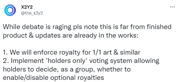 虽然之后 X2Y2 官方紧接着表示:0% 版税绝不是前进方向,并在 11 月取消「灵活版税」设置,强制执行所有 NFT 的版税,但在当时这一举动成为了人们对项目方收益口诛笔伐的导火索。