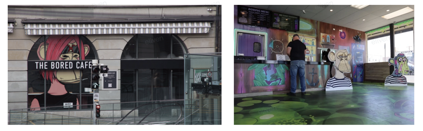 另一种是 NFT 的「由虚向实」,这种多是持有人或项目方利用 NFT 品牌效应在线下中开设实体业务,如 BAYC 持有者依靠其 IP 在线下开设的咖啡馆、饭店、饮料工厂和线下展览。