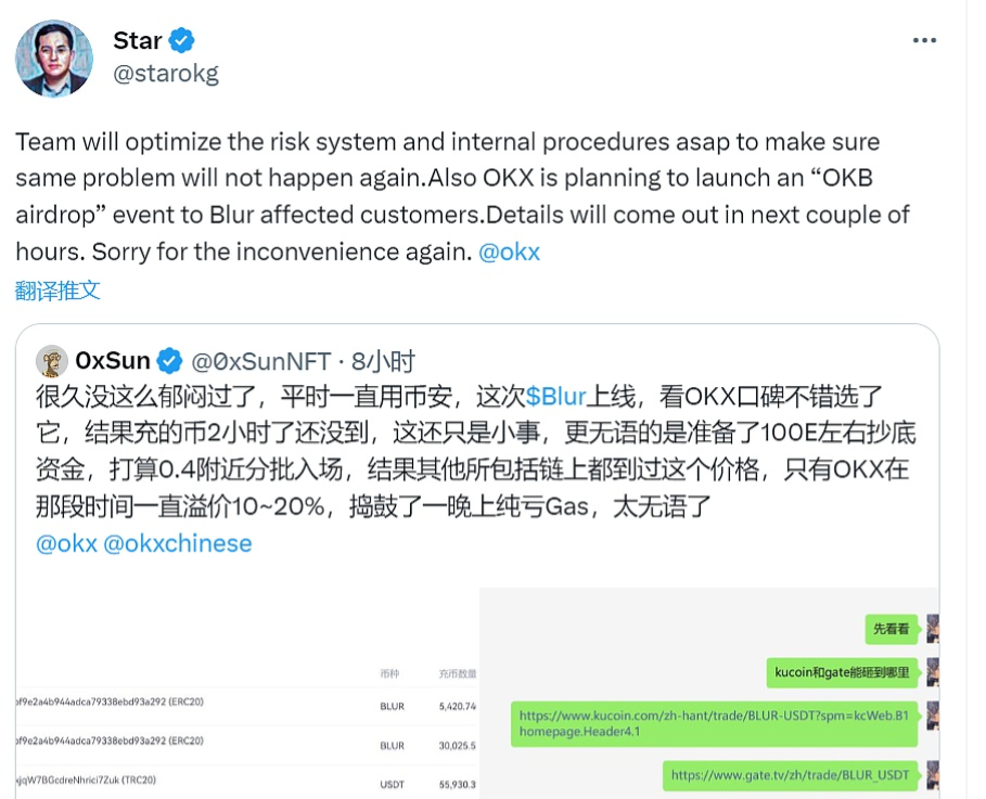 针对今日凌晨BLUR充值时出现拥堵的情况,OKX创始人徐明星发推特表示,“团队将尽快优化风险系统和内部流程,确保同样的问题不会再次发生。OKX还计划向受Blur影响的客户发起‘OKB空投’活动。具体细节将在几小时后公布。”