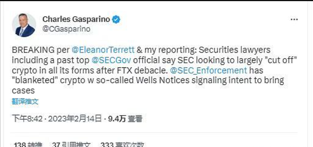 据FOX 商业网络 (FBN)高级记者Charles Gasparino在社交媒体透露,根据他和另一位记者Eleanor Terrett获得的消息称,一位前美国证券交易委员会高级官员表示,在FTX崩盘后,美国证券交易委员会希望在很大程度上“切断”所有加密货币,美国证券委员会的执法部门发出所谓的“韦尔斯通知(Wells notice)”是一个对加密货币提起诉讼的信号,“韦尔斯通知”是美国证券交易委员会对在美上市公司进行民事诉讼前发出的非正式提醒,接到通知的上市公司在收到正式诉讼前跟SEC进行沟通和协商。