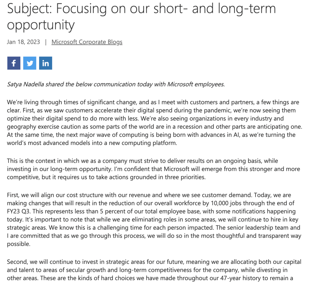 纳德拉 1 月 18 日发布裁员信|图片来源:微软官网