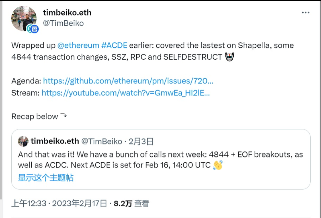 以太坊核心开发者Tim Beiko发推称,开发者Marius Van Der Wijden发现了一个公共测试网Shapellabug,该bug在空块(没有交易或取款)的完全同步期间出现,其他几个客户端也遇到了这个问题,不过,这个问题很容易测试,可以快速修补。团队认为这不会影响Sepolia升级的时间表,仍计划在2月28日12:00点进行。另外,Barnabas Busa更新了最新的对Shapella进行压力测试的提款Devnet。该Devnet有60万验证者,其中36万验证者在分叉时执行取款凭证更新。客户端看到RAM+CPU使用率激增的情况,devops团队将在未来几天监控开发网络,以查看有多少凭证更新消息被包含和丢失。该测试还揭示了Prysm<>Besu问题,其中Besu限制了它通过RPC发送的响应数量以防止DoS,但Prysm预期的响应数量高于Besu的当前限制。Besu团队目前正在调查此事。此外,开发者还计划进行另一次主网影子分叉,将在上面做一些Mev-Boost测试。2月10日以太坊基金会表示,Shanghai+Capella(Shapella)主网升级正在进入最后的预发布序列——公共测试网。Shapella包含许多功能,但对质押者和共识层来说最重要的是支持提款。退出的验证者可以全额取款,而活跃验证者余额超过32ETH的可以部分取款。另外,第一个长期存在的公共测试网Sepolia计划于2月28日进行升级。