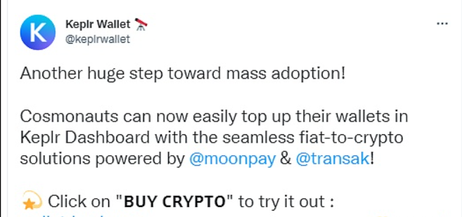 12月2日消息,Cosmos生态钱包Keplr已支持通过MoonPay和Transak使用法币购买加密货币,其中MoonPay支持购买ATOM与KAVA,Transak支持购买OSMO、ATOM与SCRT。