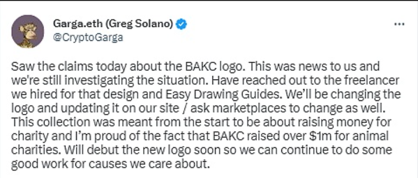 据Yuga Labs联合创始人Garga.eth在社交媒体称,Bored Ape Kennel Club(BAKC) 徽标与Easy Drawing Guides在2021年4月创建的类似设计之间有相似之处,而Easy Drawing Guides已经注意到Yuga Labs没有使用该设计的许可,同时还宣称相关Logo是其“原始绘图”并拥有该Logo图像的知识产权,且受到相关条款和条件的保护。 Garga.eth回应称刚刚知晓这件事,Yuga Labs已启动调查这一情况,而且表示将尽快更换BACK的Logo徽标,包括在网站上进行更新,同时也会在相关NFT市场进行更改。