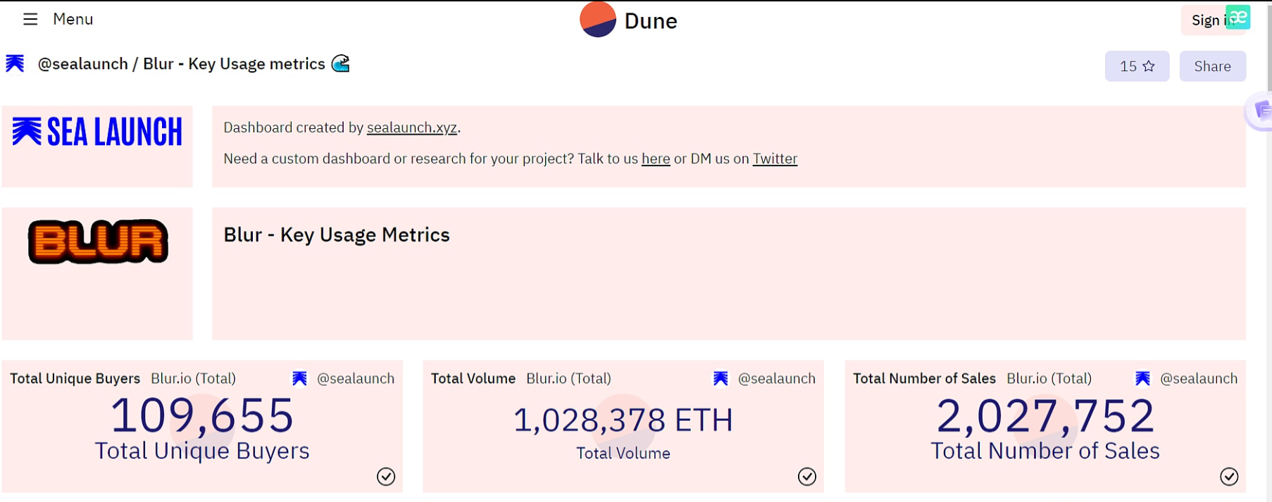 据Dune Analytics最新数据显示,NFT市场Blur总交易额已突破100万枚ETH,截至目前达到1,028,378 ETH(按照当前价格计算约合17.5亿美元),销售总量超过200万笔,当前达到2,027,752笔,此外Blur平台独立买家数量为109,655个。