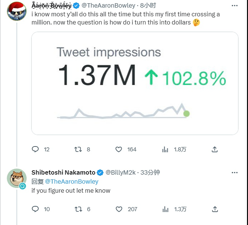 2月18日消息,针对推特网友表示其推文展示量(Tweet impression)首次超过100万,但问题是不知道怎么把它变成美元。Elon Musk回复表示,正在致力于这方面的工作。 金色财经此前报道,马斯克表示,推特将调整算法功能,以推荐用户感兴趣的内容。