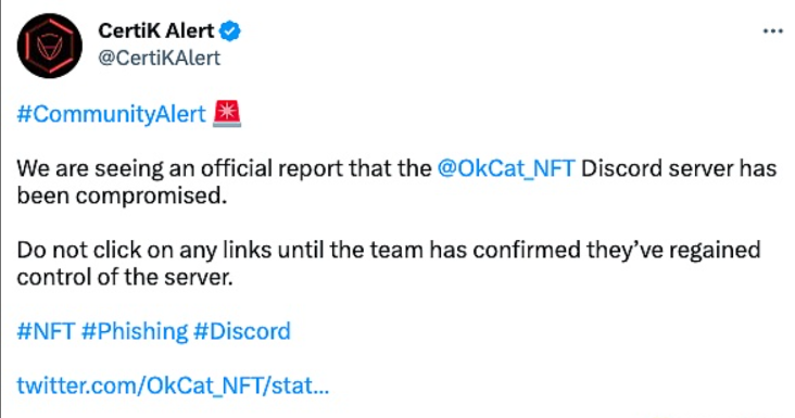 据CertiK监测,OkCatOfficial项目Discord服务器遭到攻击。请社区用户在服务器修复之前不要点击任何链接。