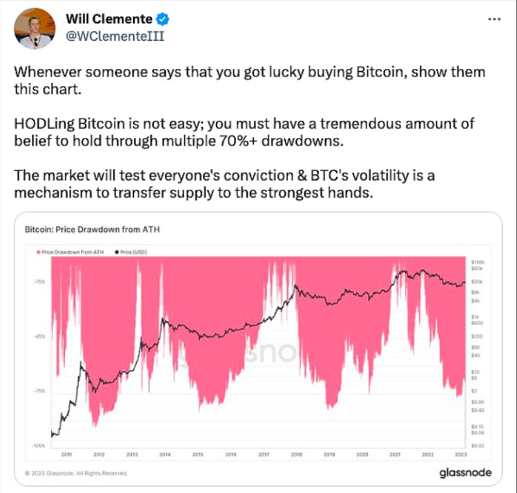 Reflexivity Research联合创始人Will Clemente在社交媒体发文称,每当有人说你买比特币很幸运,就给他们看这个图表。买入比特币并不容易。你必须有巨大的信念,才能在多次70%以上的跌幅中坚持下去。市场将考验每个人的信念,而BTC的波动性是一种机制,将供应转移到最强的人手中。