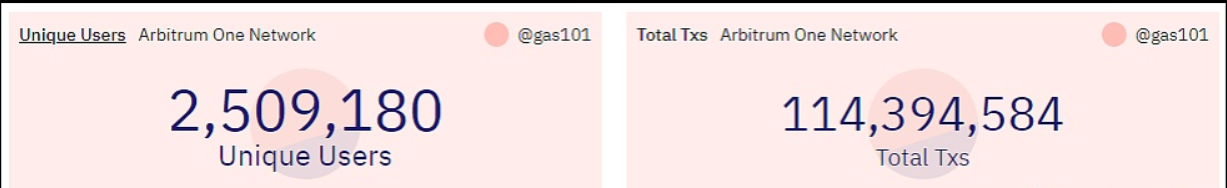 据Dune Analytics最新数据显示,Arbitrum One Network独立用户量已超250万,当前为2,509,180个,网络交易总量突破1亿笔,本文撰写时达到114,394,584笔。此外,Arbitrum One总存款量也超过了200万枚ETH,截止目前为2,196,555 ETH,按照当前价格计算约合37亿美元,Arbitrum Nova总存款量为12,228 ETH,约合2000万美元。
