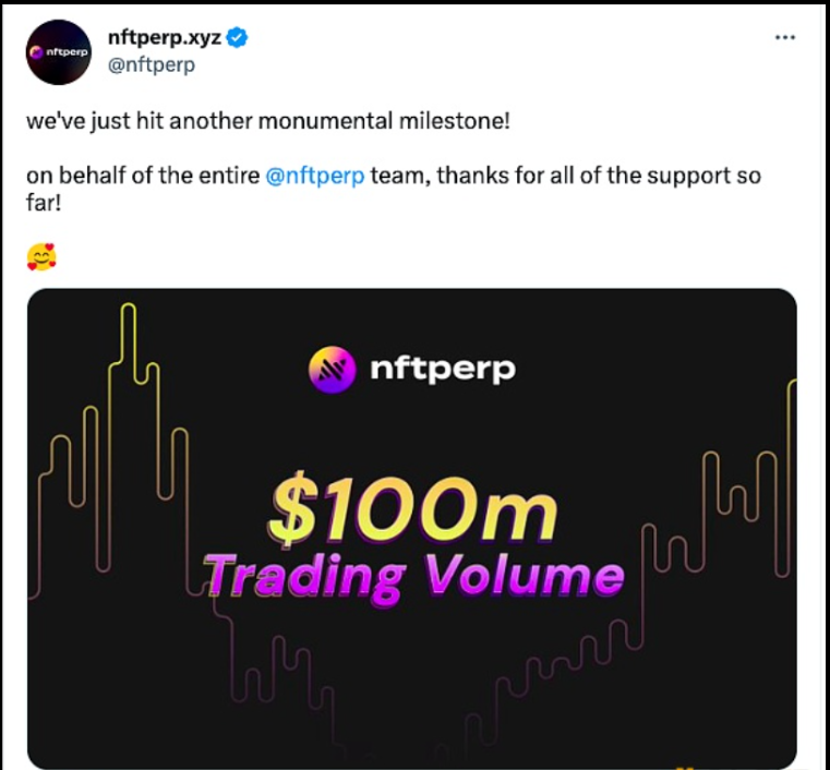 2月19日消息,NFT 永续合约交易平台 nftperp 官方发文表示,其平台交易总量达到 1 亿美元里程碑。 金色财经此前报道,2022 年 11 月 27 日,NFT 永续合约交易平台 nftperp 宣布以 1700 万美元估值完成 170 万美元种子轮融资。