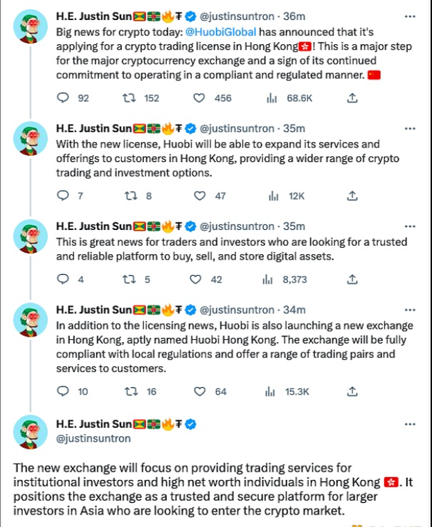 Huobi 全球顾问委员会成员 Justin Sun 在社交平台发文表示,Huobi 宣布在香港申请加密货币交易牌照,将持续致力于以合规和规范的方式运营。新牌照将能够扩展其向香港客户提供的服务和产品,提供更广泛的加密货币交易和投资选择。 同时,Huobi 还在香港推出了一个新的交易平台 Huobi Hong Kong,该交易平台将完全遵守当地法规,并为客户提供一系列交易和服务。
