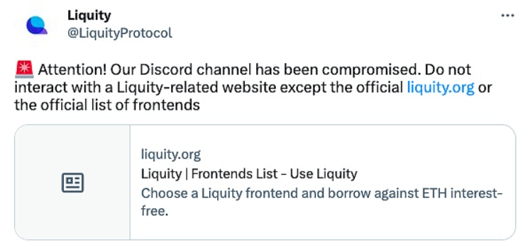 DeFi 借贷协议 Liquity 表示其官方 Discord 频道遭入侵,提醒用户注意钓鱼网站风险,请勿点击官方列表以外的链接。