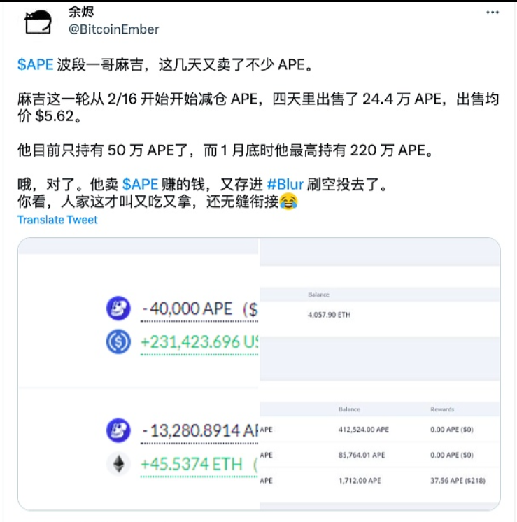 2月20日消息,推特用户余烬表示,中国台湾歌手黄立成从2月16日开始减仓APE,近四日出售24.4万枚APE,目前仍持有约50万枚APE,其1月底曾持有约220万枚APE。他卖APE赚的钱,又存进Blur刷空投。黄立成目前在Blur Bidding Pool中的以太坊超过4000枚。