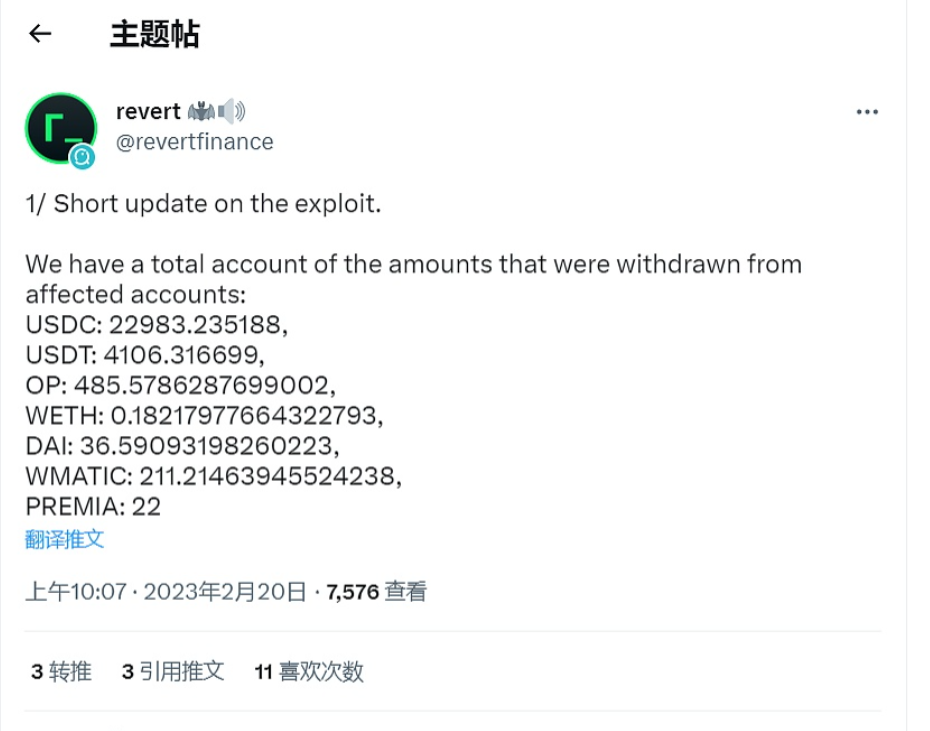 AMM 流动性管理协议 Revert Finance 发推称,“v3utils”合约被攻击,其中有 90% 资金是从单个账户中盗取,被盗窃资产包括:22983.235188 枚 USDC、4106.316699 枚 USDT、485.5786287699002 枚 OP、0.18217977664322793 枚 WETH、36.59093198260223 枚 DAI、211.21463945524238 枚 WMATIC 与 22 枚 Premia。 大部分对该合约的授权已被取消,并对剩余易被攻击资金进行白帽处理,但有一些没有余额的地址仍被攻击合约进行授权。Revert 提醒这些地址取消授权。接下来几天团队将发布关于此次攻击事件的完整报告,并为被攻击用户进行赔偿。