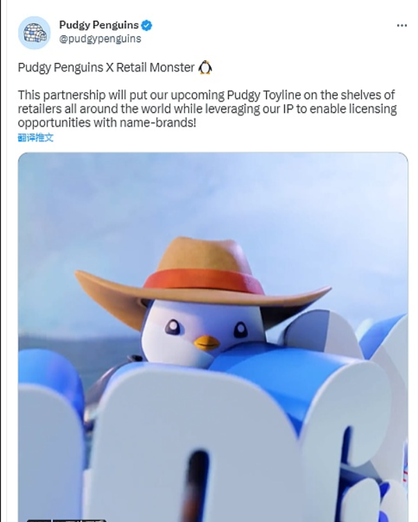 NFT项目“胖企鹅”Pudgy Penguins在社交媒体宣布已与Retail Monster达成合作,将在全球线下零售店上架其IP商品Pudgy Toyline,Retail Monsters拥有代理迪士尼、梦工厂和孩之宝等大品牌的经验,后续还将作为授权代理,通过他们的合作伙伴和关系为 Pudgy Penguins 提供授权机会。
