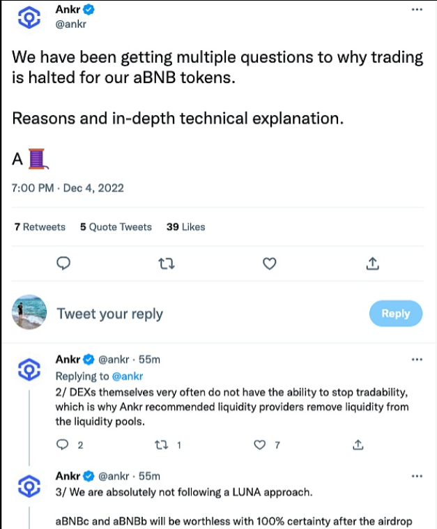 Ankr发文解释aBNB交易停止的原因:DEX本身没有停止交易的能力,所以 Ankr 建议流动性提供者从流动性池中移除流动性。Ankr 绝对不会效仿LUNA的解决方式。在新的ankrBNB Token空投后,aBNBc 和 aBNBb 将毫无价值。ankrBNB将是唯一可兑换质押BNB的Token(未受漏洞利用影响)。 因此,Ankr建议所有流动性提供者将aBNB移除,以避免投机交易,因为 DEX 通常无法阻止交易能力,Ankr 也无法阻止投机交易,也无法控制其它 DeFi 协议。 Ankr还表示其团队正在全天候无休工作,以补偿此前受黑客事件影响的用户。 此前消息,12月2日,Ankr称将进行快照并向在攻击前持有aBNBc的用户重新发行ankrBNB,并购买500万美元BNB补偿LP。Ankr还表示,该项目将使用储备金赔偿 aBNBc 流动性提供者,已开始收集受影响者的名单。