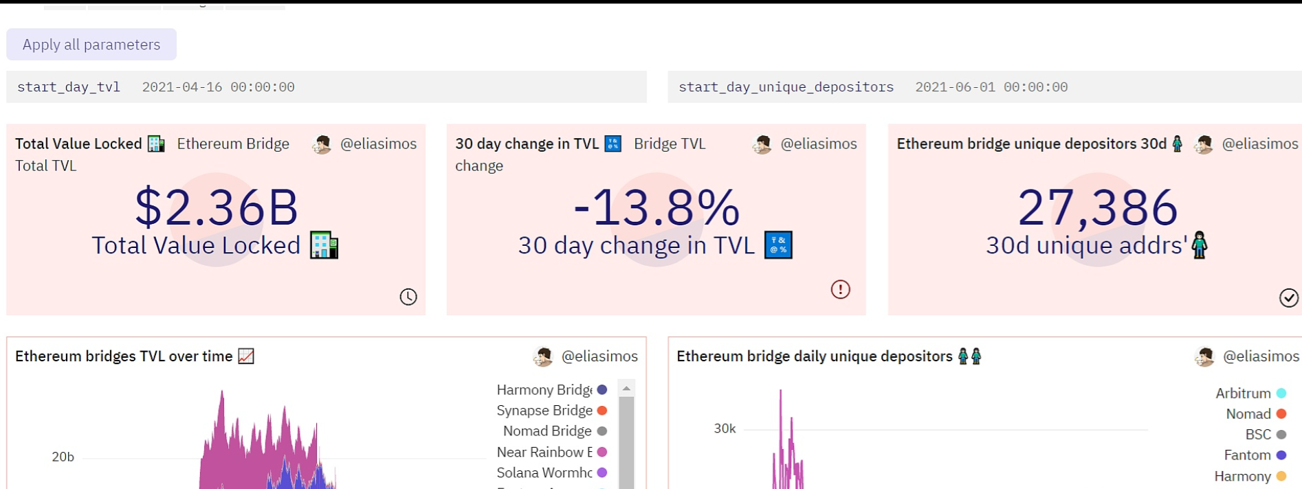 Dune Analytics数据显示,以太坊桥当前TVL跌至236亿美元,30日跌幅-13.8%,其中锁仓量最高的5个桥分别是Polygon Bridges(31.28亿美元)、Arbitrum Bridges(13.31亿美元)、Optimism Bridges(9.28亿美元)、Avalanche Bridge(54.18亿美元)、Fantom Anyswap Bridge(1.8亿美元)。