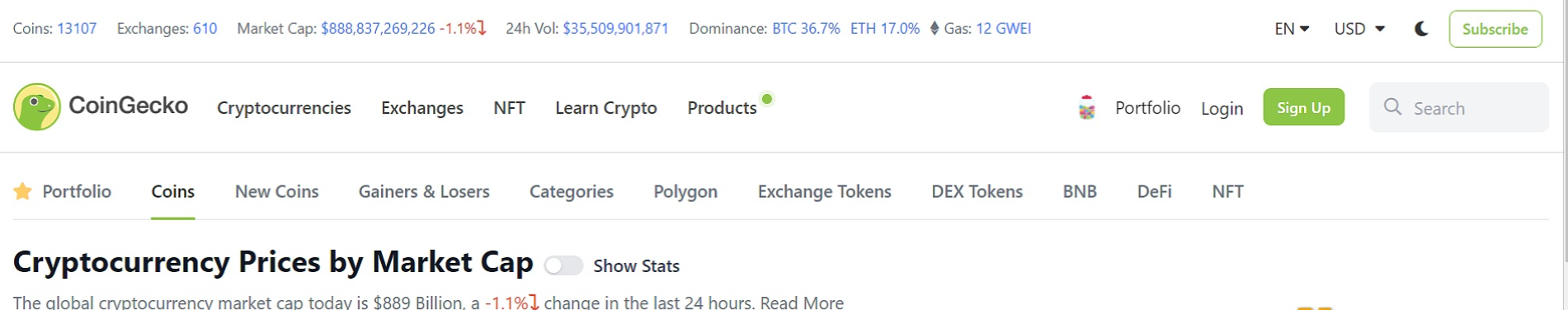 据CoinGecko数据显示,当前加密货币市值为8888.37亿美元,24小时交易量为355.09亿美元,当前比特币市值占比为36.7%,以太坊市值占比为17%。