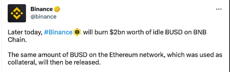 Binance 在社交媒体上发文表示,将于今日销毁 20 亿枚 BNB Chain 上 BUSD,作为抵押品的以太坊上 BUSD 将被释放。