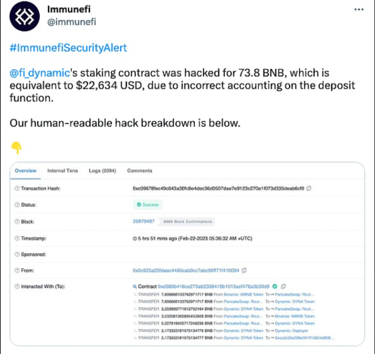 智能合约漏洞赏金平台Immunefi在社交媒体上称,dynamic.fi由于对存款功能的会计处理不正确,Dynamic的质押合约被黑了 73.8 BNB,价值约 22,634 美元。 对此,Dynamic官方称,我们的质押合约被利用了,我们正在对合约进行升级以包括重入保护,并将很快对其进行审核。为了恢复,我们正在回购 DYNA 并将其分发给受影响的用户。