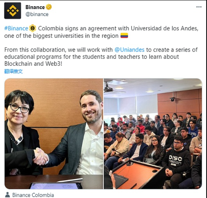 Binance官方发布推文表示,Binance Colombia与哥伦比亚安第斯大学签署合作协议,将创建一系列教育计划,以便让学生和教师了解区块链和Web3。