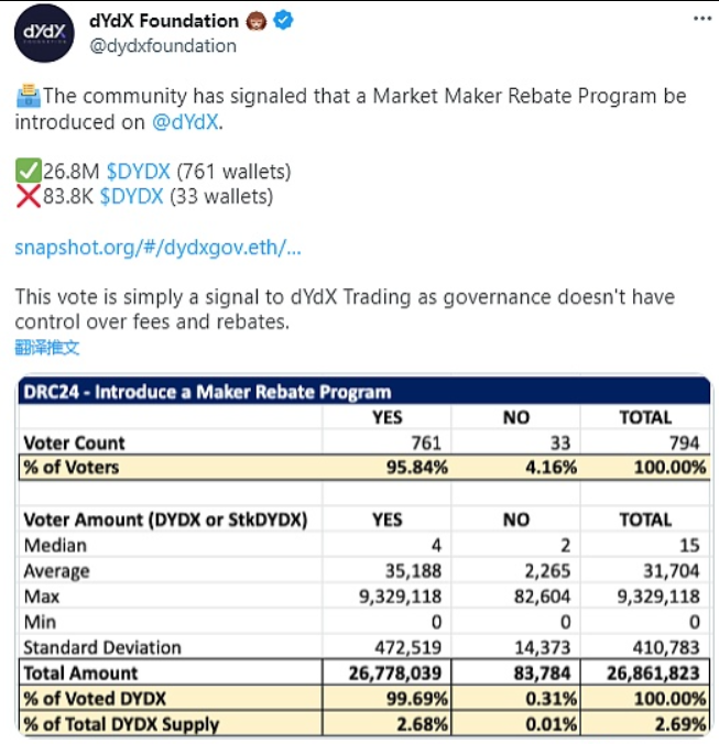 实施返利计划从而激励流动性。dYdX表示,该提案仅仅是一项建议,因为dYdX无法通过治理决定费用和返利。