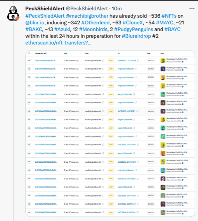 据PeckShield监测显示, 黄立成(推特账号Machi Big Brother)为准备Blur空投,在过去24小时已在Blur出售536枚NFT,包括342枚Otherdeed、63枚CloneX、54枚MAYC、21枚BAKC、13枚Azuki、12枚Moonbirds、2枚PudgyPenguins和BAYC等。