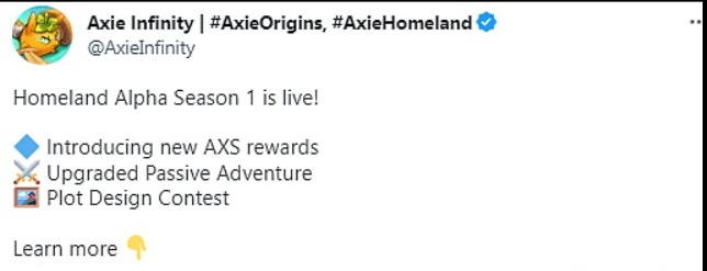2月22日消息,链游 Axie Infinity 宣布已启动 Homeland Season 1,本赛季将持续至 3 月 22 日。本赛季期间,Axie Infinity 将举行地块设计比赛,并依据创造力、和谐度等进行评分。 此外,本赛季添加了组队功能,并对升级速度、Boss 强度和能量恢复速度等游戏机制进行了改动。