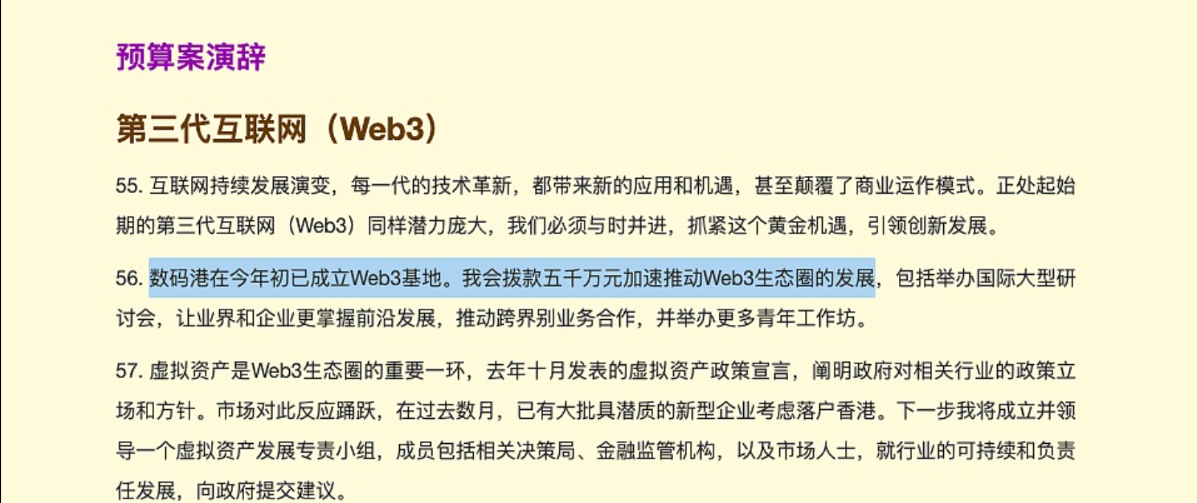 2月22日,香港特区政府财政司司长陈茂波在发表2023-2024年度特区政府财政预算案时表示,数码港在今年初已成立Web3基地。我会拨款五千万元加速推动 Web3 生态圈的发展,包括举办国际大型研讨会,让业界和企业更掌握前沿发展,推动跨界别业务合作,并举办更多青年工作坊。虚拟资产是Web3生态圈的重要一环,去年十月发表的虚拟资产政策宣言,阐明政府对相关行业的政策立场和方针。 市场对此反应踊跃,在过去数月,已有大批具潜质的新型企业考虑落户香港。下一步我将成立并领导一个虚拟资产发展专责小组,成员包括相关决策局、金融监管机构,以及市场人士,就行业的可持续和负责任发展,向政府提交建议。