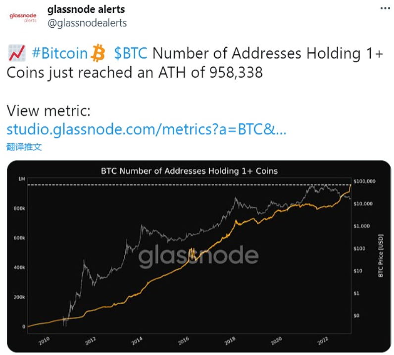 持有超过1枚以上比特币的地址数量刚刚达到958,338个,再次创历史新高。
