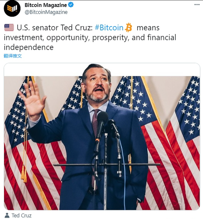 美国参议员Ted Cruz表示,Bitcoin意味着投资、机会、繁荣和财务独立。 Bitcoin Magazine发文写道,“随着越来越多的政客寻求利用Bitcoin的力量,现在不是问Bitcoin能为他们做什么,而是问他们能为Bitcoin做什么。”