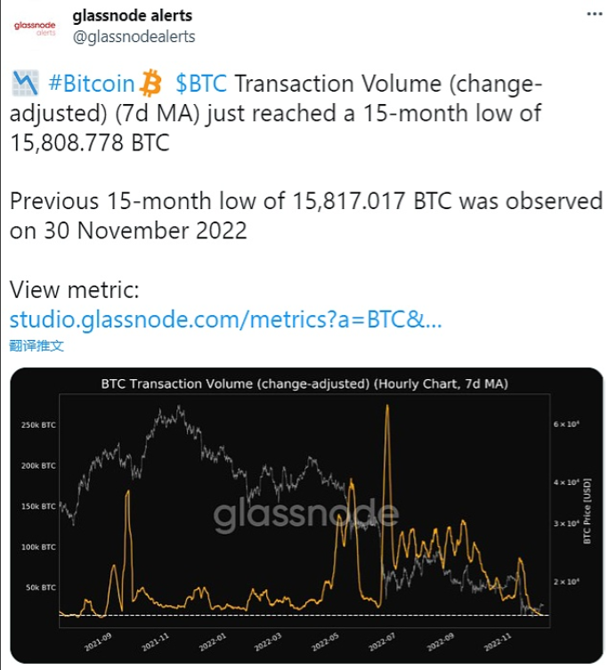 据Glassnode数据显示,比特币链上交易量(变动调整后)在过去一小时(7日均值)刚刚达到15,808.778 BTC,创15个月新低。 此前,11月30日观察到的15个月低点数值为15,817.017 BTC。