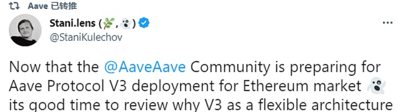 Aave创始人Stani Kulechov发推表示,“现在,Aave社区正准备在以太坊上部署Aave V3”。