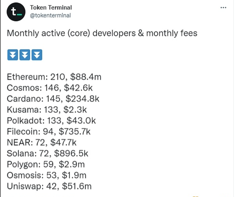 Token Terminal在社交媒体披露了各区块链活跃(核心)开发者数量和月费用收入数据,具体为:以太坊活跃(核心)开发者数量210人、月费用收入8840万美元;Cosmos为146人、4.26万美元;Cardano为145人、23.48万美元;Kusama为133人,2300美元;Polkadot为133人、4.3万美元;Filecoin为94人、73.57万美元;NEAR为72人、4.77万美元;Solana为72人、89.65万美元;Polygon为59人、290万美元;Osmosis为53人、190万美元;UniSwap为42人、费用收入5160万美元。