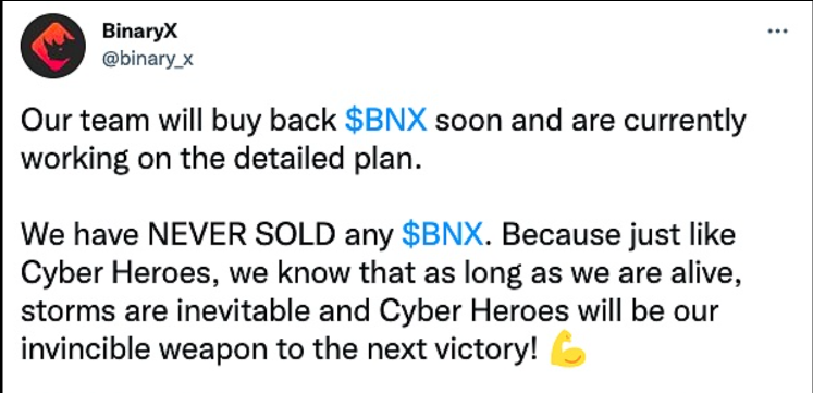 链游开发商 BinaryX 在推特上表示,团队将实施代币回购计划,目前正在讨论计划的细节。此外,BinaryX 称团队并未出售任何 BNX 代币。据币安行情显示,BNX 代币价格近两日已下跌超 50%。Binance Labs 于 2021 年 12 月宣布对 BinaryX 进行投资,投资金额未披露。