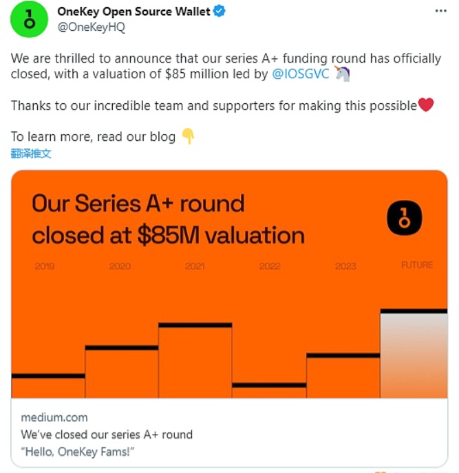 硬件钱包公司OneKey宣布以8500万美元估值完成A+轮融资,IOSG Ventures领投。 此前报道,2022年9月28日,硬件钱包公司OneKey宣布完成约2000万美元A轮融资,由Dragonfly、Ribbit Capital领投。