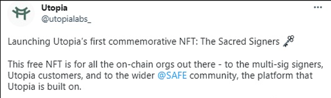 2月23日消息,DAO 薪酬支付系统 Utopia 宣布推出首款免费铸造纪念 NFT,将开放 24 小时,多重签名用户、Utopia 客户及更广泛的 Safe 社区等所有链上组织有资格铸造。 此前报道,Utopia 于 2022 年 6 月宣布完成 2300 万美元 A 轮融资,Paradigm 领投,Kindred Ventures 、Circle Ventures、Gusto、Coinbase Ventures 等参投。