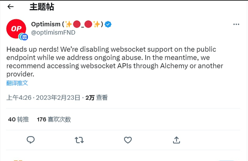 以太坊L2 Optimism在官方推特表示,为了解决持续滥用公共端点问题,出于谨慎考虑并保护正常的HTTP流量,Optimism将在公共端点上禁用WebSocket服务支持,后续如果需要WebSocket支持可使用Alchemy等基础设施提供商,Optimism建议项目运行自己的节点或选择使用来自可信赖合作伙伴的基础设施解决方案。