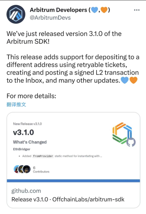 据Arbitrum官方推特,Arbitrum目前已正式发布Arbitrum SDK 3.1.0版本,该版本增加部分新功能,包括:使用可重试票证(retryable tickets)在不同地址存款、支持创建签名L2交易、修复createRetryableTicket没有正确分布在属性上的问题、以及更新Arbitrum Goerli和Arbitrum Nova区块浏览器链接等。