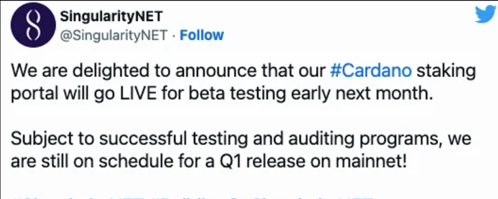 2月24日消息,SingularityNET在推特上宣布,该项目的Cardano质押门户网站将于下个月推出beta测试版本,该团队计划在今年第一季度在主网上推出质押门户网站。 该质押门户将允许AGIX代币持有者在Cardano网络上押注代币。据悉,该项目去年推出了ERC-20代币转换器,允许用户将他们的AGIX从以太坊移动到Cardano。