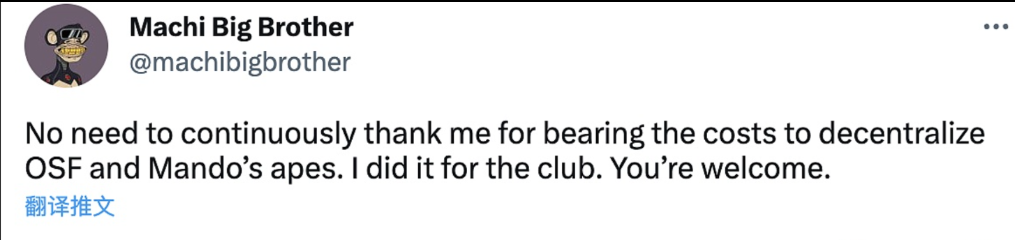 麻吉大哥黄立成@machibigbrother在社交媒体发文称:“不需要不断感谢我为了去中心化OSF和Mando的猴子而承担的费用成本,我所做的都是为了社区,不客气。” 此前消息,持有70余枚BAYC的NFT巨鲸近日通过Blur以大约1000万美元的价格将其抛售,本次抛售由匿名交易员Mando和OSF进行。