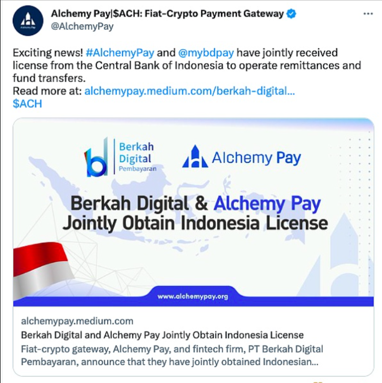 加密货币支付网关 Alchemy Pay 宣布获得了印度尼西亚央行颁发的经营汇款和资金转账牌照,与 Alchemy Pay 同时获得该牌照还有可进行低成本线上转账的应用 BDPay 开发公司 PT Berkah Digital Pembayaran。